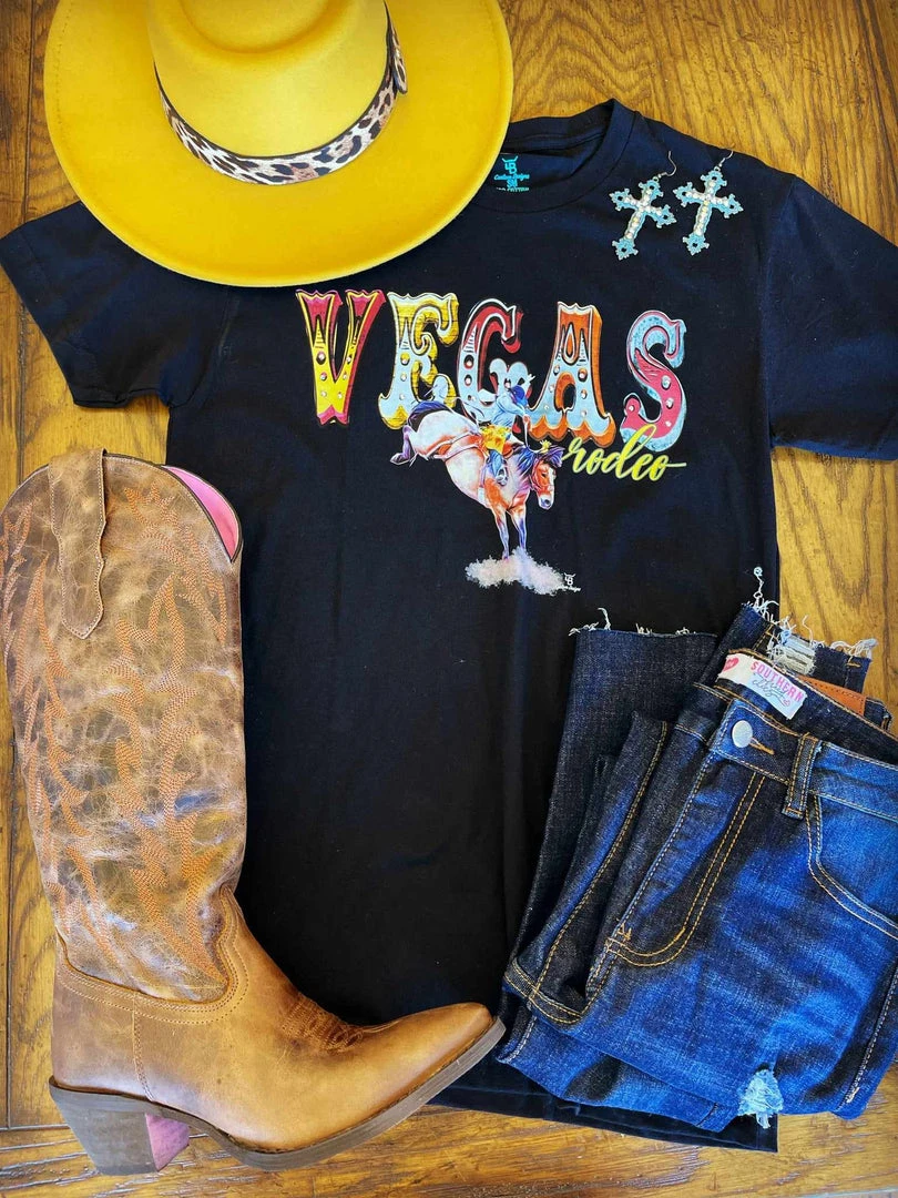 Graphic tees. We are here for them! We found the perfect tee to wear while in Vegas or to the rodeo! Perfect for layering and pairing with your sequins! Printed on a black tee. Unisex fit. Custom-made just for you!