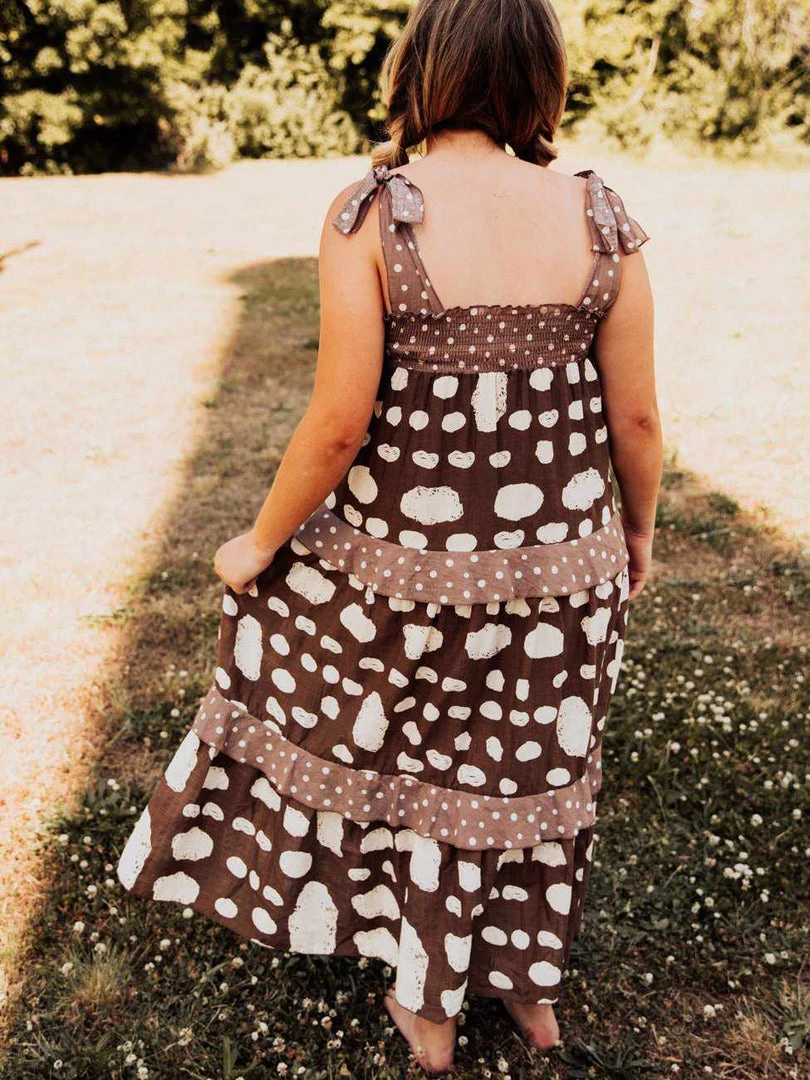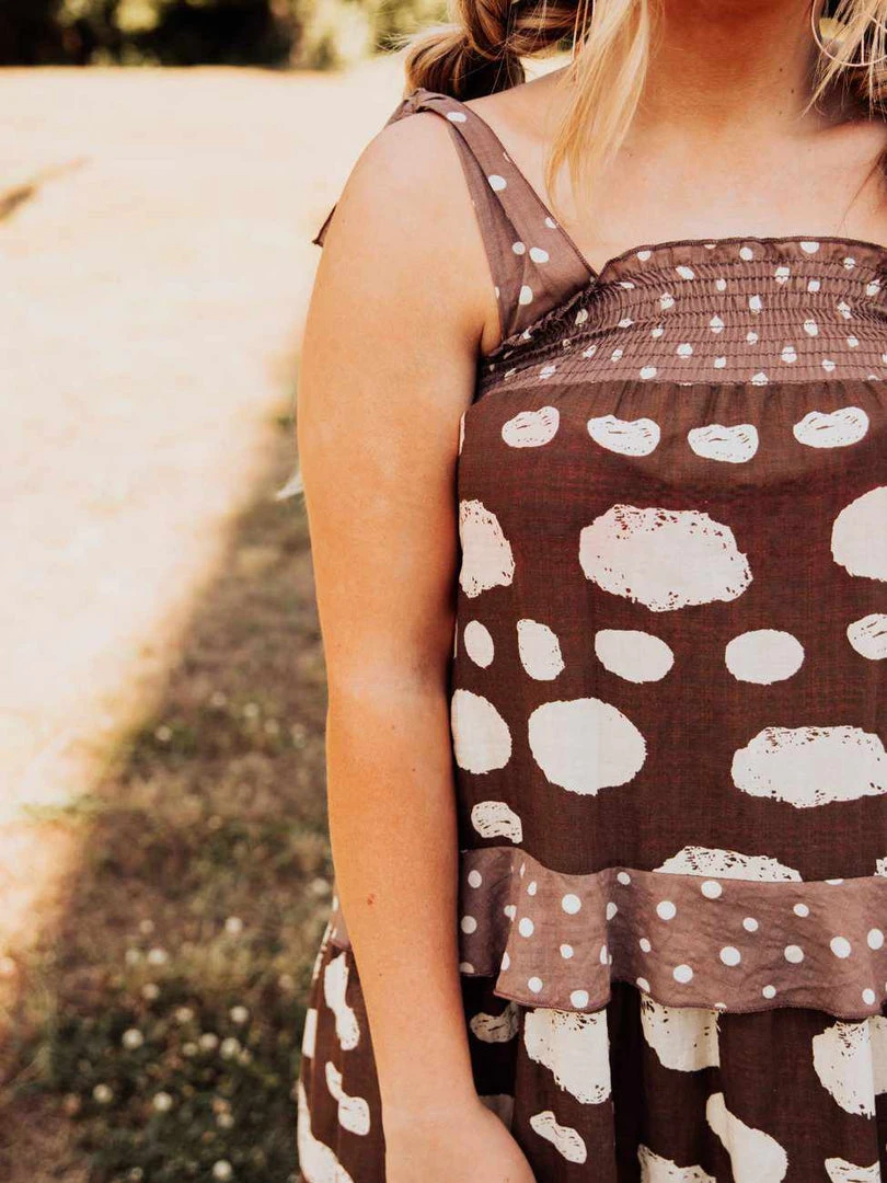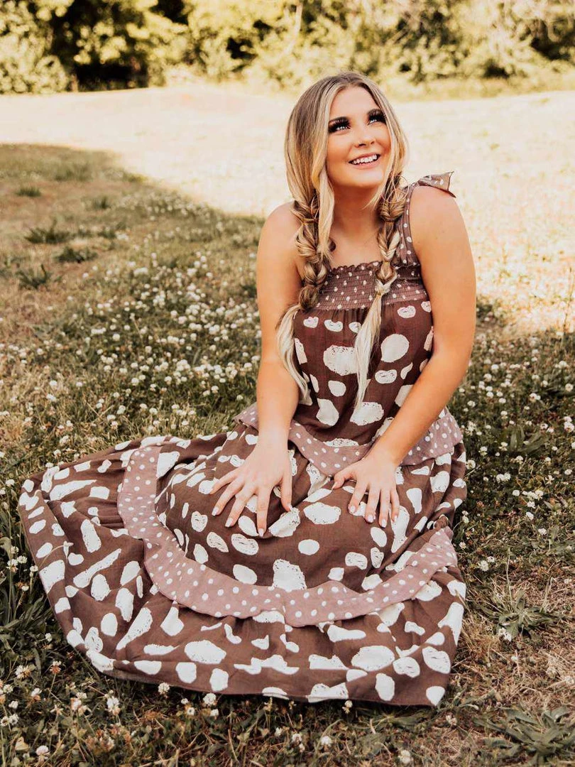 Summer is here and we have the perfect dress for you! Wear the “Mocha Day” Midi Dress for a day out with your girls! Perfect for an outing to a winery, sipping your favorite glass of wine! Very flowy and comfortable. It also has a stretchy ruching at the top and ties on the shoulders. The cream dots throughout add the final touch to this dress and it features two ruffles that hit you in the most flattering places!