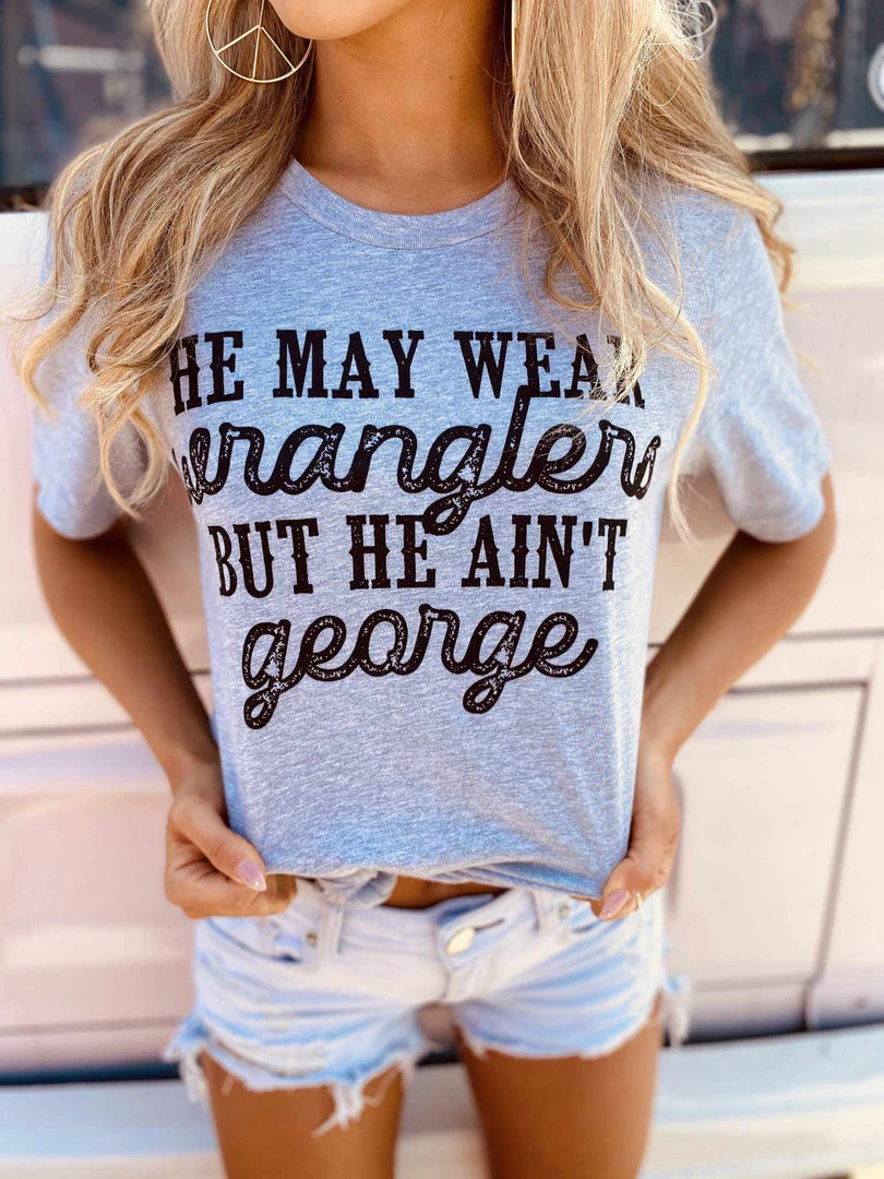 He May Wear Wranglers But He Ain’t George! This tee is so true for all of our George Strait lovers! We are loving this Buckin’ Barn T-Shirt! Pair this with your favorite cutoff denim shorts and Western Boots! Heather Dusty Blue Tee.