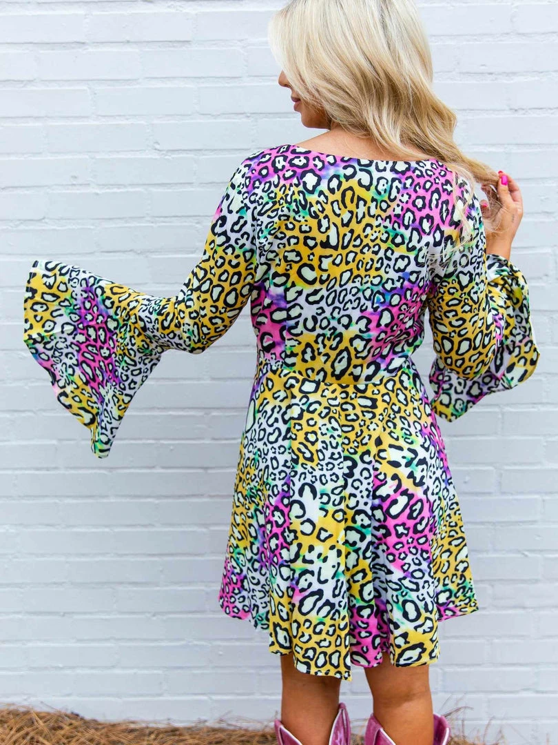 This bell sleeve dress has serious flare, and we don’t mean the cuffs! This white bell-sleeve dress boasts a neon leopard pattern perfect for drawing eyes and showing thighs! It’s cut just above the knee so this dress is practically begging for a great pair of stomping boots. It even comes in plus size!