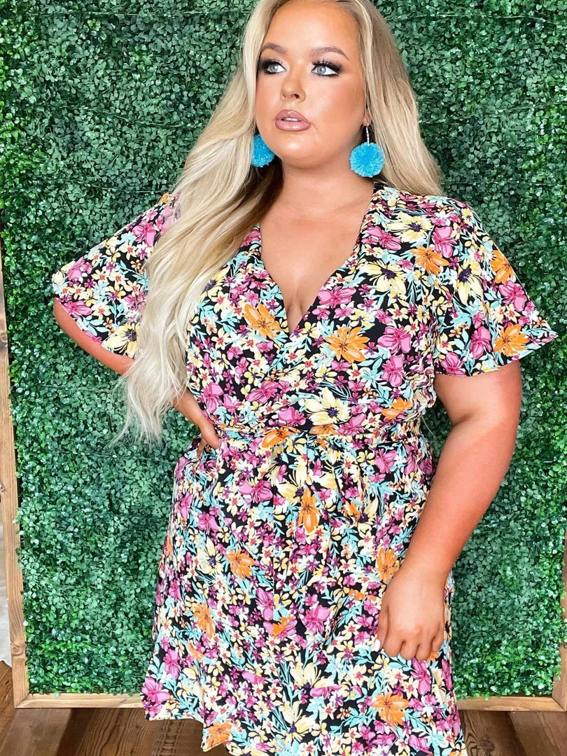 Your go-to floral dress for summer! This wrap dress has a black base with beautiful pink, yellow and blue floral print throughout. The wrap top and flowy sleeves are figure flattering for every size! Back zipper.
