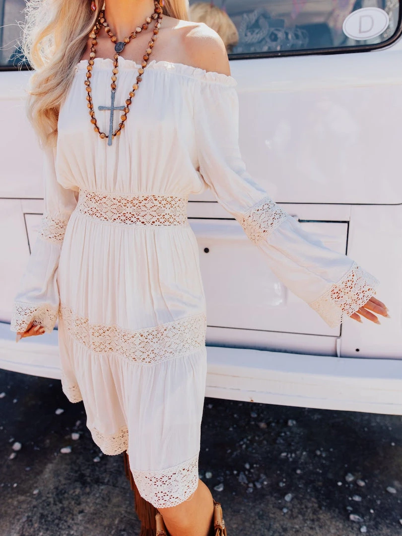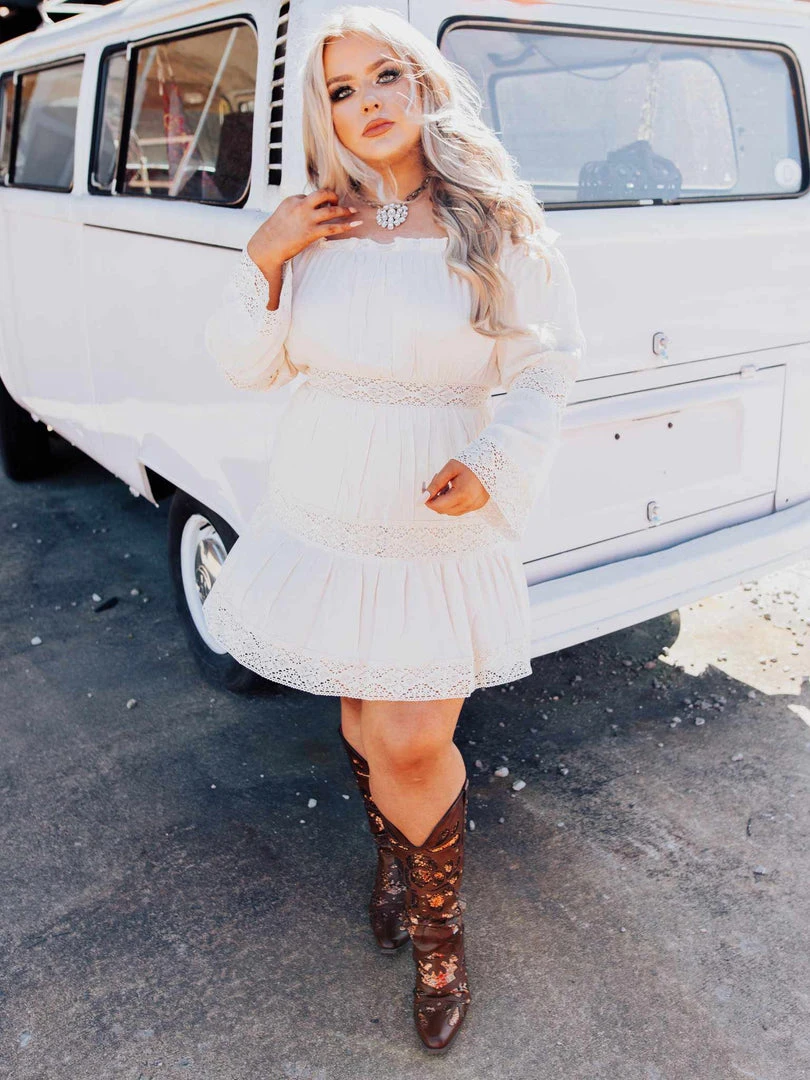 For a minimalist summer look, the Better Together dress features an off-the-shoulder style with long sleeves, a flowy skirt, zipper back, and lace trim. Perfect for nighttime walks on the beach this summer.