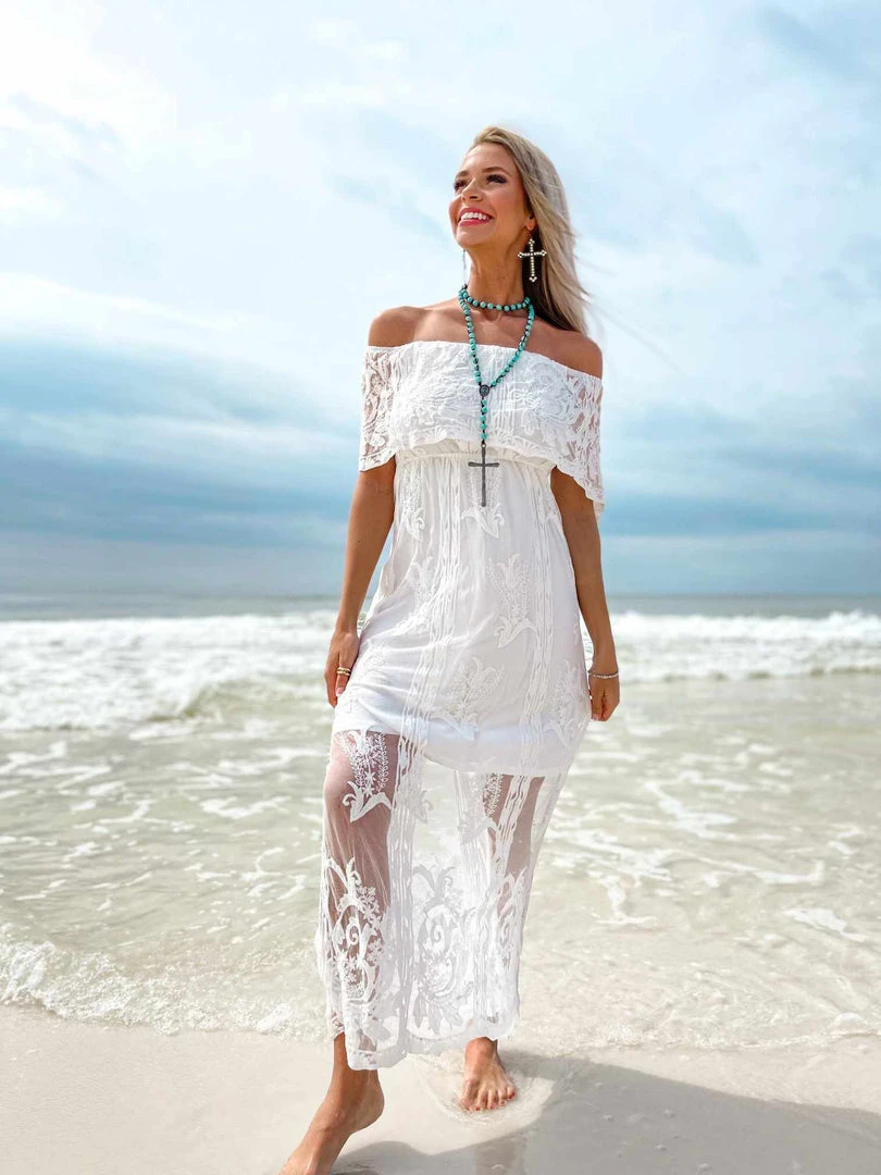 Romantic and boho-chic, the Bridal Ivory Off Shoulder dress is the perfect style for the carefree bride. Featuring a lace overlay and illusion skirt with floral details throughout for an effortless yet beautiful look on your wedding day.