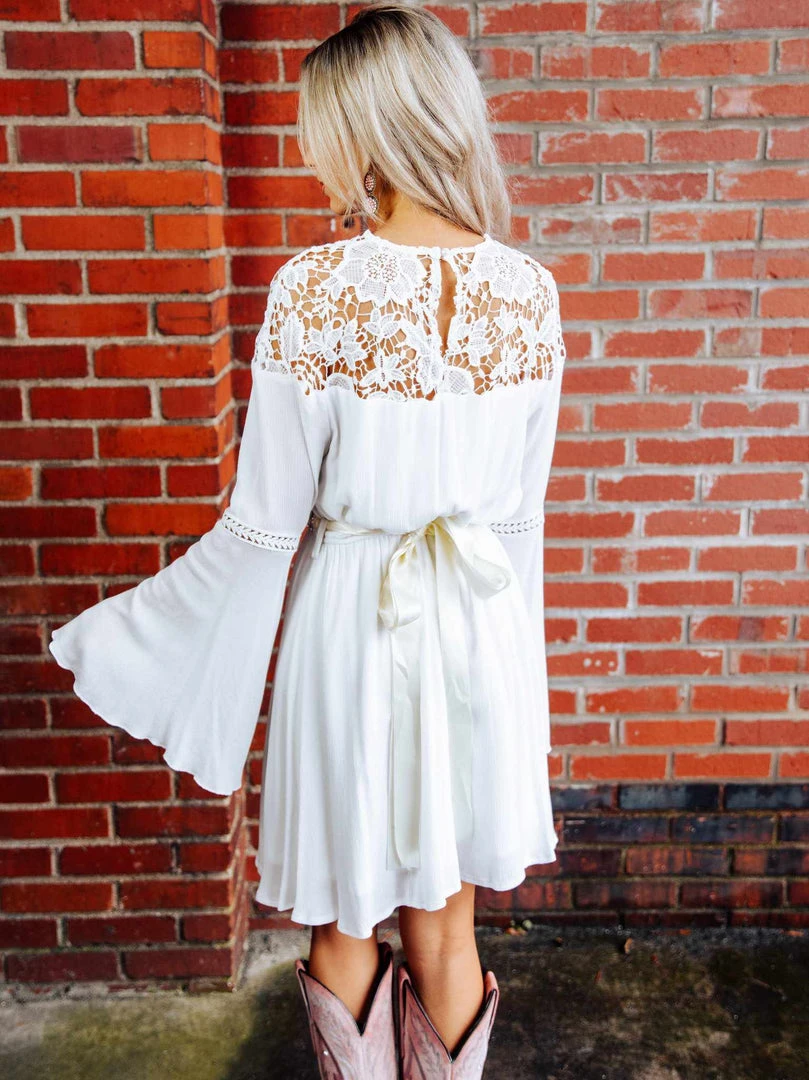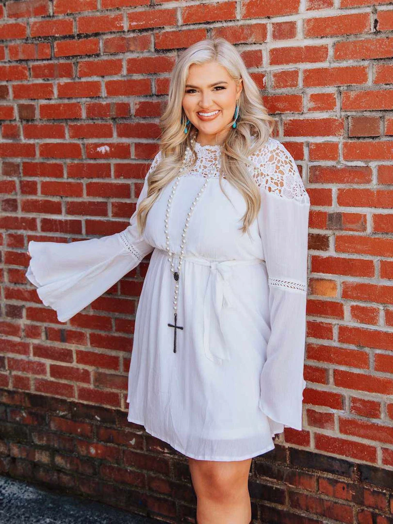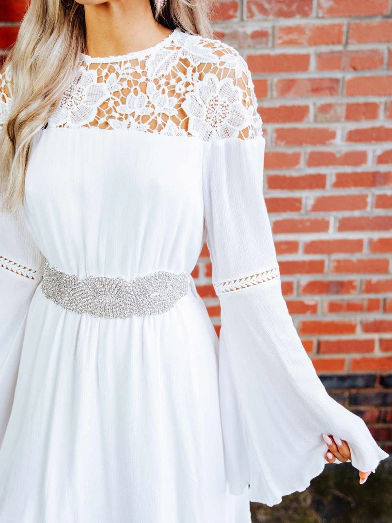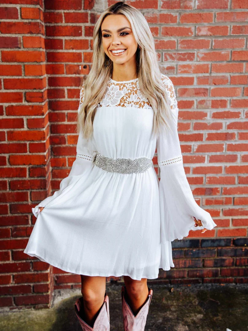 With long sleeves and beautiful lace applique, the Lily Grace dress is a must-have for spring and summer. Pair it with the Rhinestone Crowning Moment belt for an ultra-glam look.