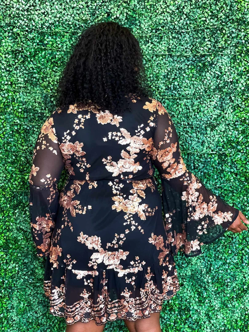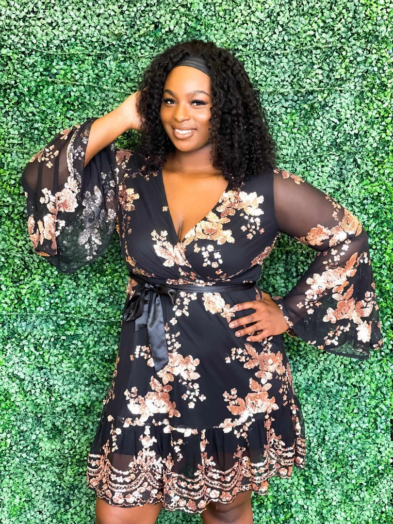 Just like you, this black wrap dress is something special. It’s not just any little black dress. This wrap dress rocks rose gold sequins! The Lacey Belle is going to be your forever dress, paired with your favorite western boots or dress it up with heels! It fits perfectly and even comes in plus sizes. It features a black tone lining and has a v-neck neckline with an elastic waist, and unlined bell sleeves. At the bottom, the dress has a ruffle of lace. A black satin belt is included with this dress, but not attached. The rose gold sequin on the black material is absolutely stunning and so elegant!