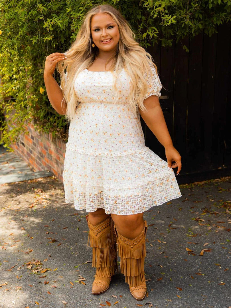 This summer dress is fresh as a daisy – several daisies in fact! This square neck white dress features a delicate daisy print throughout. The capped sleeves and lace detail make this dress the perfect staple to add to your summer wardrobe. Lined for coverage.