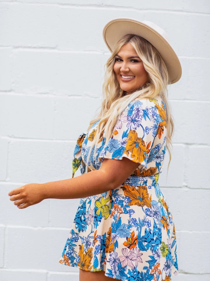 The “Tropical Escape” Romper will be your favorite romper this vacation! You will be sure to pack this one in your suitcase! It features a beautiful and fun blue floral print! Pops of orange and yellow to brighten up anyones day! This romper is short sleeve with a butterfly look. Lined for more coverage. It ties in the front and features a keyhole under the bust area.
