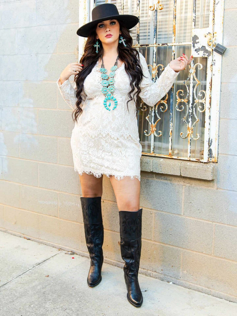 This lacy long sleeve little white boho mini dress makes a great date night number. Fun, flowy, lacy, and light, it’s perfect for a warm night on the town or an evening out with your besties. This white boho mini looks amazing with a lovely set of new boots. The deep V neckline is sure to turn heads or capture the attention of that someone special. For a pop of color with this long sleeve boho mini dress, add one of our bralettes. The stretchy material and fitted band waist will fit anyone; it even comes in plus sizes!
