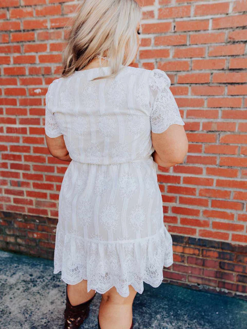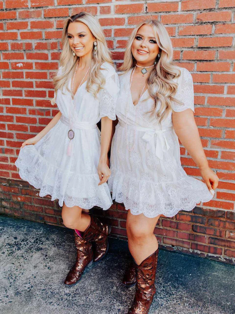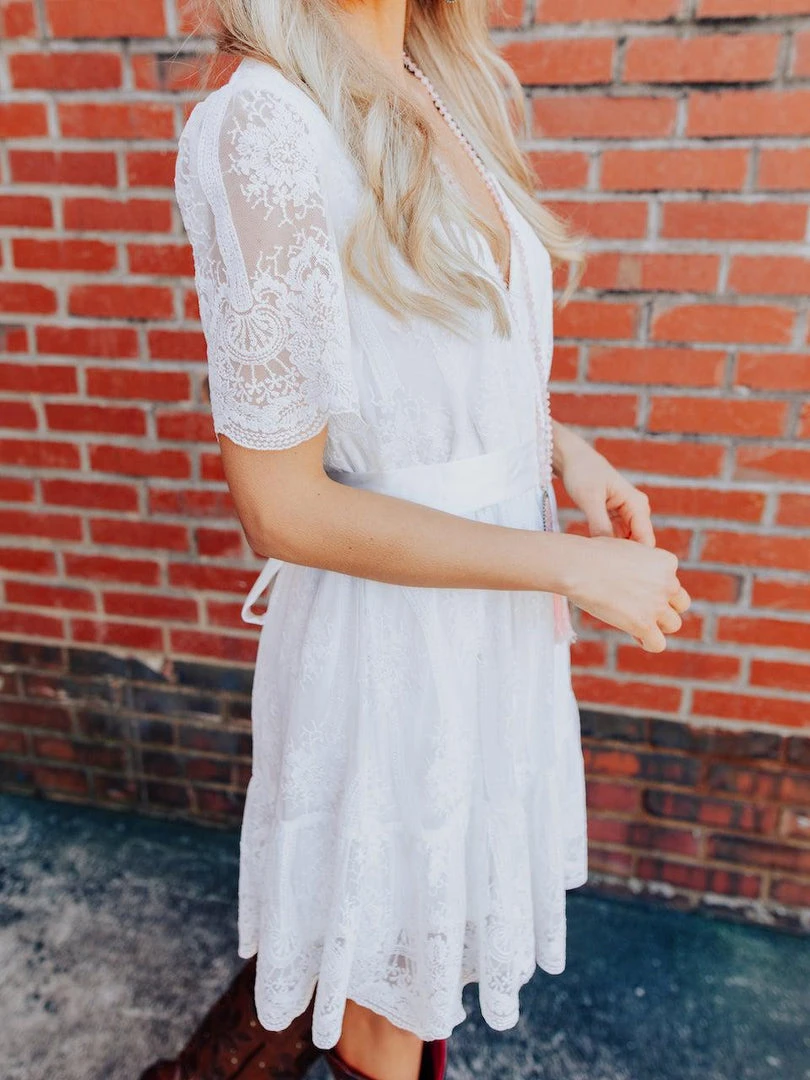 Where dainty meets fun. The Feeling Flirty dress features short sleeves, a floral lace applique overlay, and a satin ribbon belt that adds the perfect feminine touch.