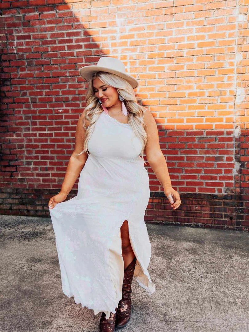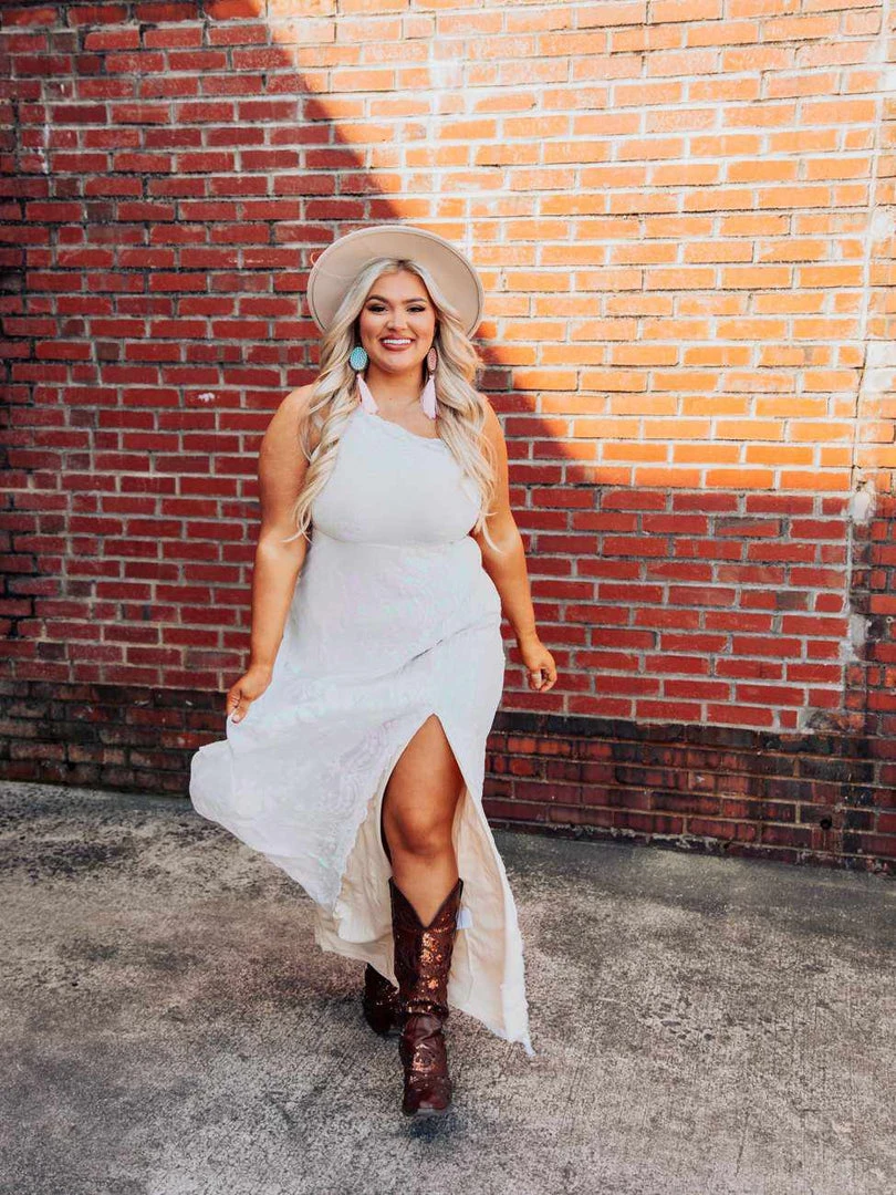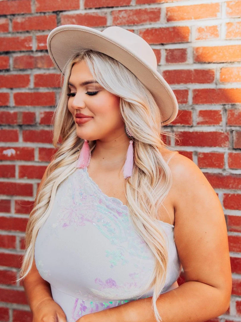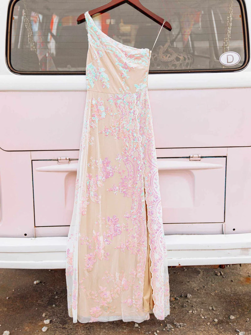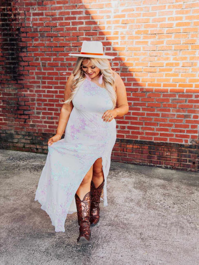 Lights. Camera. Action. With this dress, you are going to look like a movie star who is walking the red carpet! The “Hollywood Nights” Dress is a sequin dress, with a gorgeous sequin pattern and one-shouldered with a scalloped neckline. This dress does have a slit in the front for that extra sassiness! You are going to steal the show in this beauty! This material does have stretch and the dress is lined. “Hollywood Nights” is designed by our owner, Liz, and part of the Chics Collection. Nude liner.