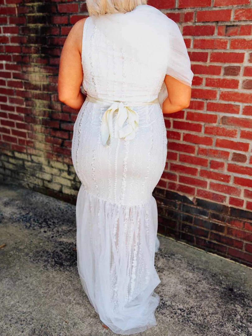 Stunning in every way imaginable, the Pure Beauty mermaid style dress features a beautiful sheath overlay with lace applique detailing for a vintage romantic vibe. Figure flattering with a zipper back. Perfect for your destination wedding. Pair it with a rhinestone belt to complete the look.