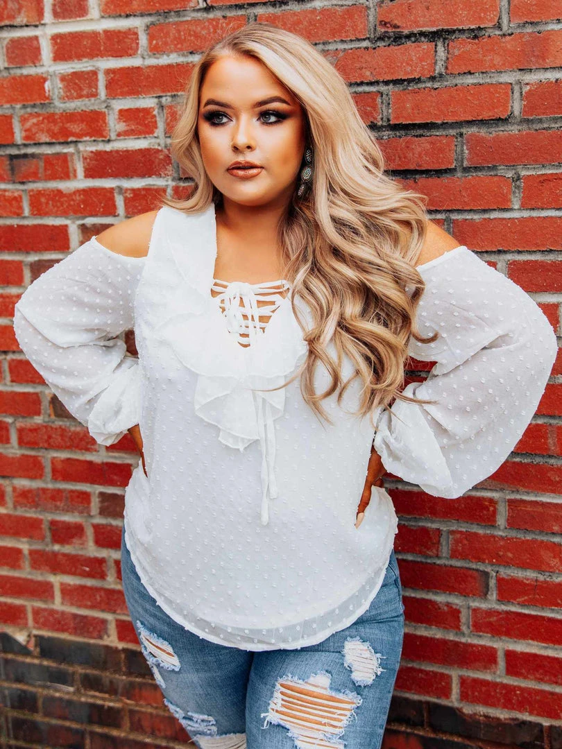A long-sleeve cold-shoulder style ruffled top with a swiss dot pattern. Pair it with jeans and sandals or boots. Multiple colors available.