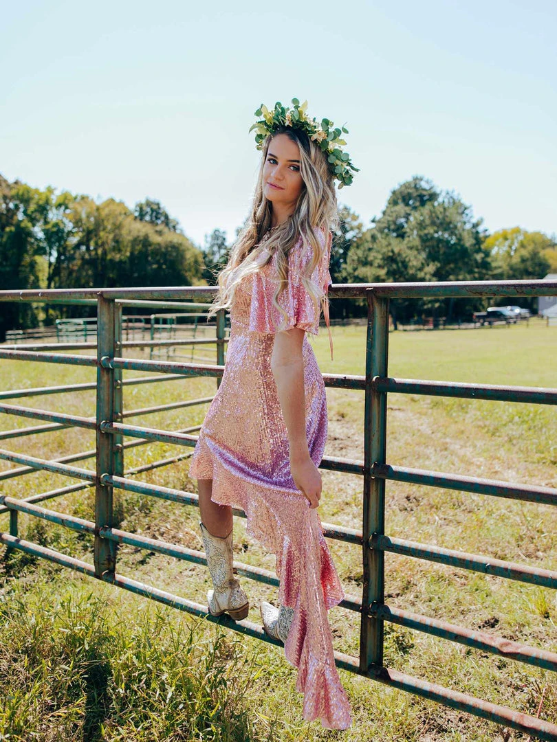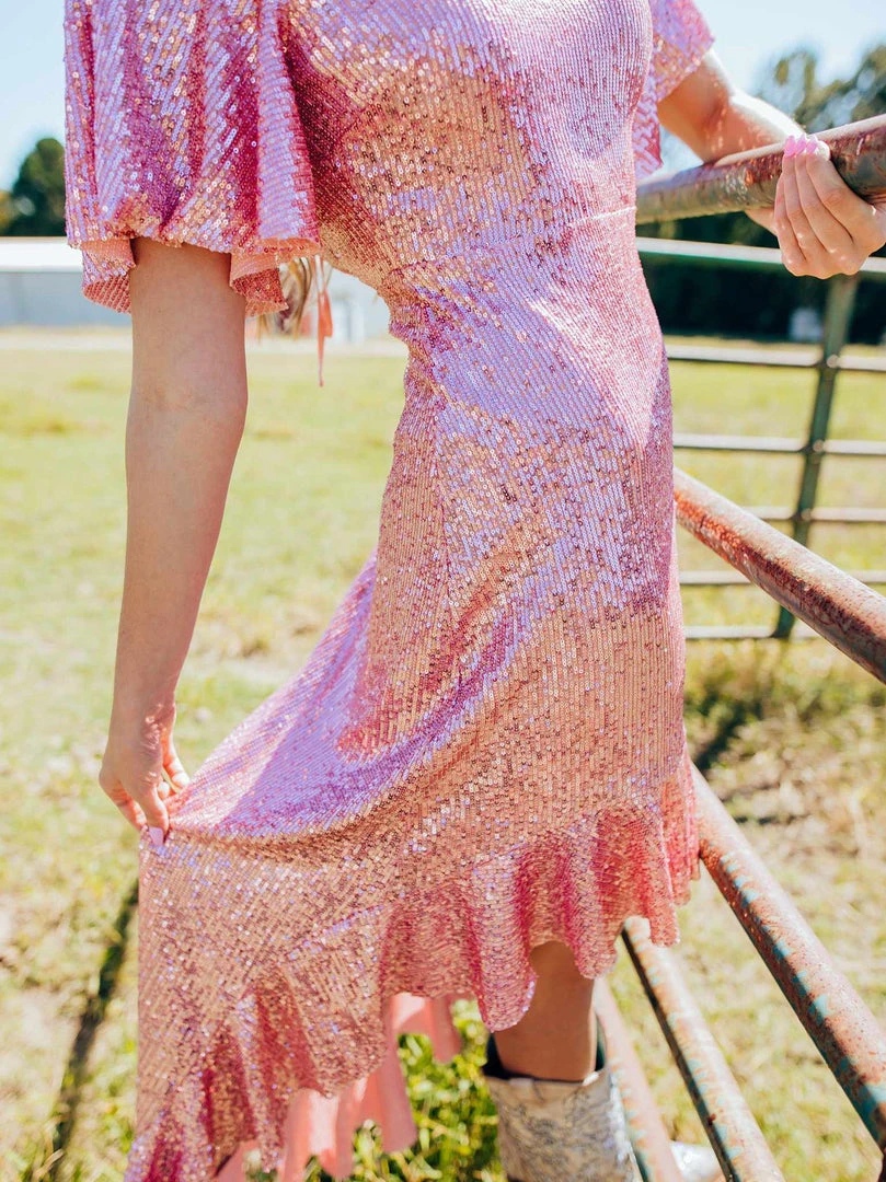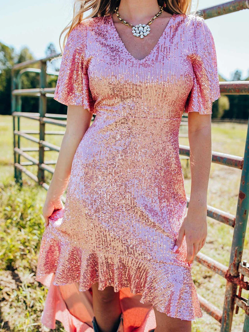 The dress that was made for your unforgettable moments in the spotlight. Our exclusive Southern Sweetheart high low dress has everything you want for when it’s time to sparkle and shine. With all-over sequins, a keyhole back. ruffle trim, and flowing short sleeves, you are definitely going to own the night.