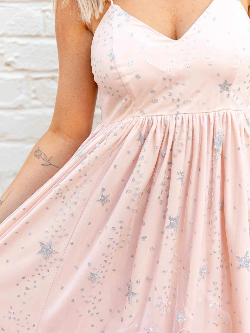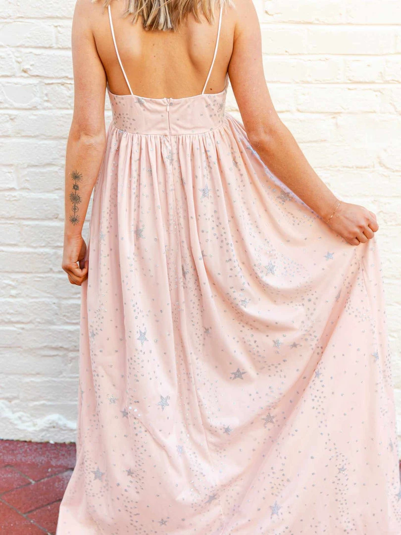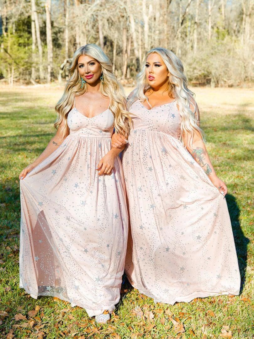 Shine bright in our “Reona Star” Dress! This dress is gorgeous and sure to make you sparkle for any occasion. Wear for date night, formal events or even photoshoots! True to size. Models are wearing a size XS & XL. Fitted through bust area.