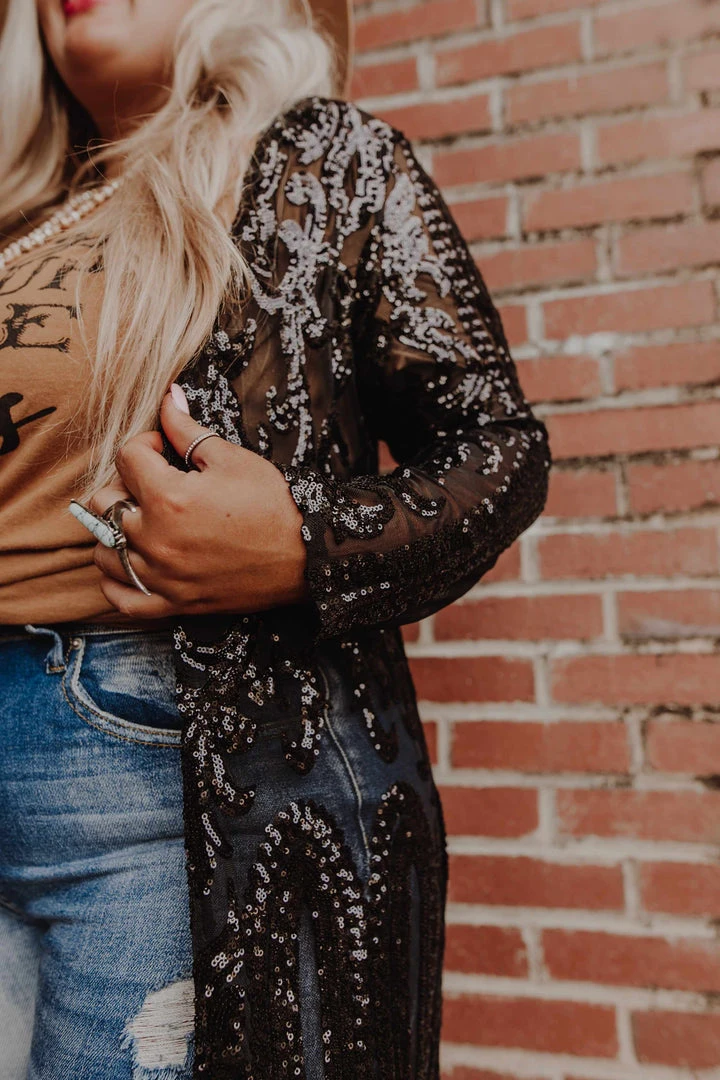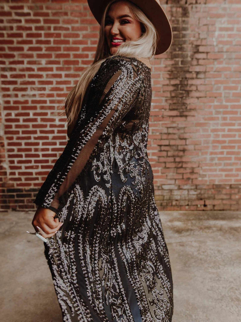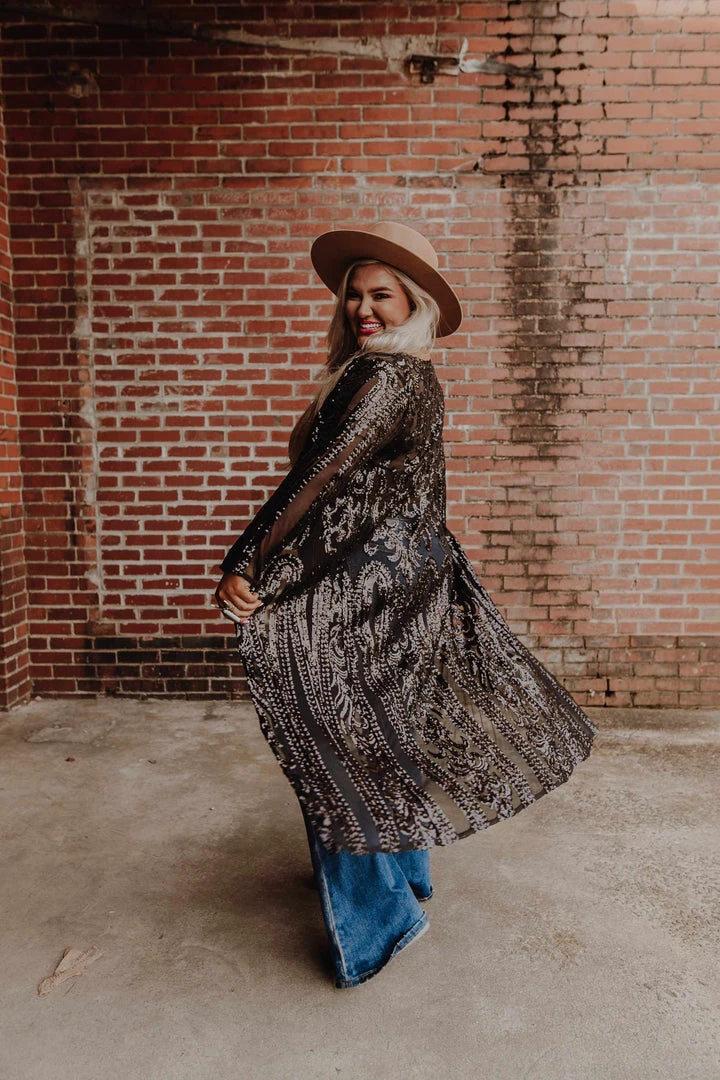 This handmade long kimono sequin duster is absolutely AMAZING! Great for special occasions, dates, or concerts. Even special for holidays like Christmas, New Years, and all year round events. With its lightweight flattering fit, it is sure to have you sparkle and shine anywhere you go! This piece is a LIMITED EDITION! Pair a duster with your favorite tops, bottoms or dresses for a sassy look!