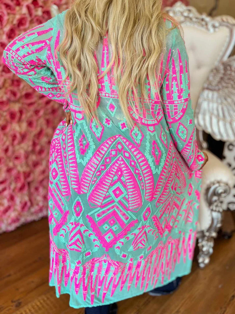 Handmade, this duster is absolutely AMAZING! Great for special occasions, dates, or concerts, this Southern Fried Chics Duster is a MUST HAVE! It’s long sleeve, has a complimentary fit, and is sure to have you sparkle and shining anywhere you go! This piece is a LIMITED EDITION! Pair this duster with your favorite tops and bottoms or dresses for a sassy look!