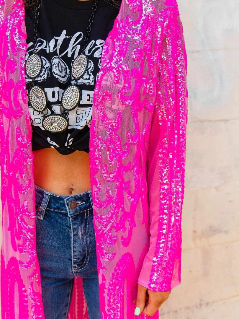 This handmade long sequin duster is absolutely AMAZING! Great for special occasions, dates, or concerts. With its complementary fit, it is sure to have you sparkle and shine anywhere you go! This piece is a LIMITED EDITION! Pair a duster with your favorite tops, bottoms or dresses for a sassy look!
