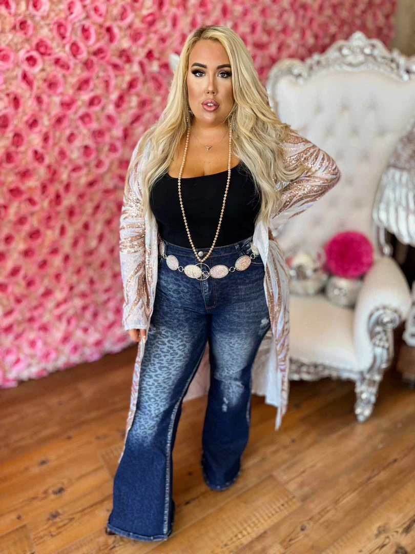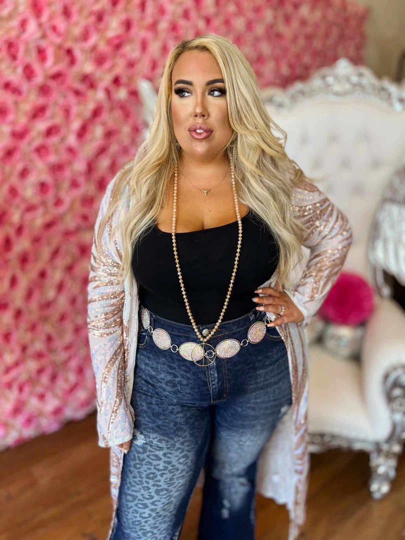 This handmade long kimono sequin duster is absolutely AMAZING! Great for special occasions, dates, or concerts. Even special for holidays like Christmas and the 4th of July. With its lightweight flattering fit, it is sure to have you sparkle and shine anywhere you go! This piece is a LIMITED EDITION! Pair a duster with your favorite tops, bottoms or dresses for a sassy look!