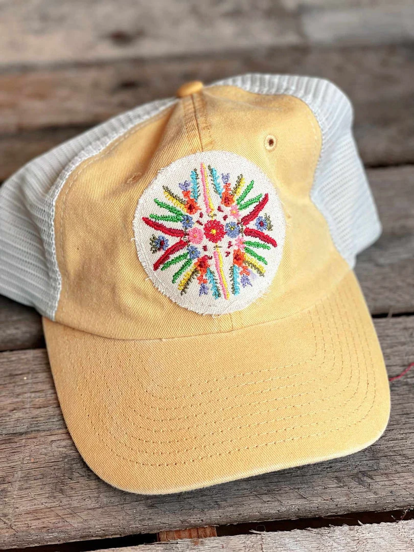 Circle Floral Patch Hat. Perfect for a day out with your best girls! It’s great for those dreadful bad hair days or days you just don’t feel like doing your hair! Yellow-Stone Colored Hat.