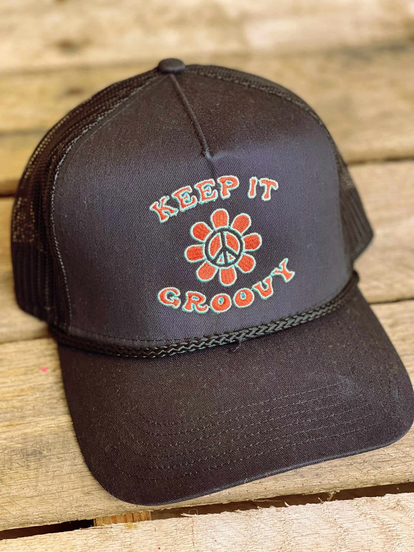 Keep It Groovy Hat features a fun flower and peace sign. Pair this with your favorite graphic tee, cutoff denim shorts, and Western Boots! This hat is great for those dreadful bad hair days! Black cap with Light Blue and Orange threading.