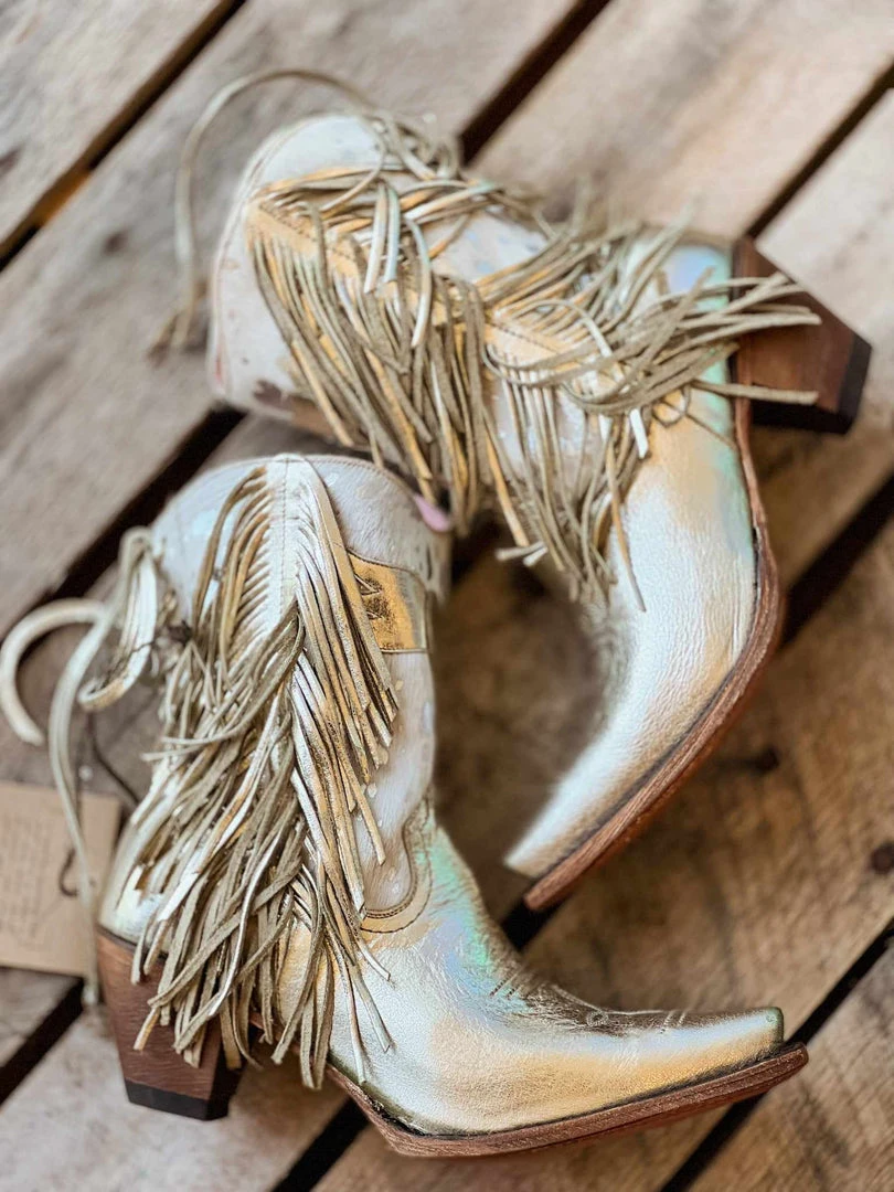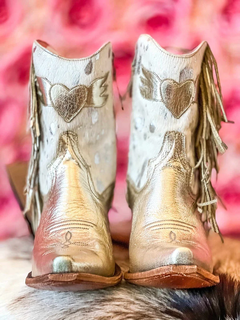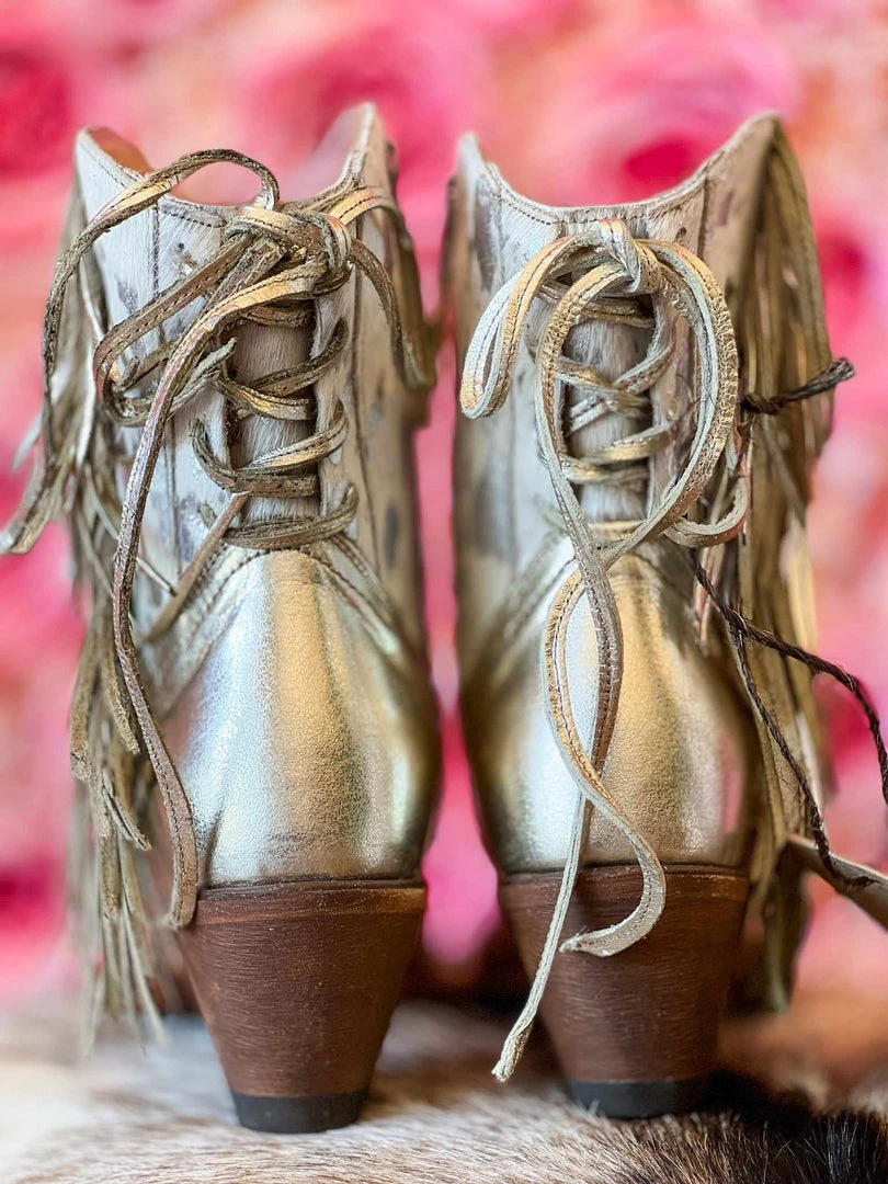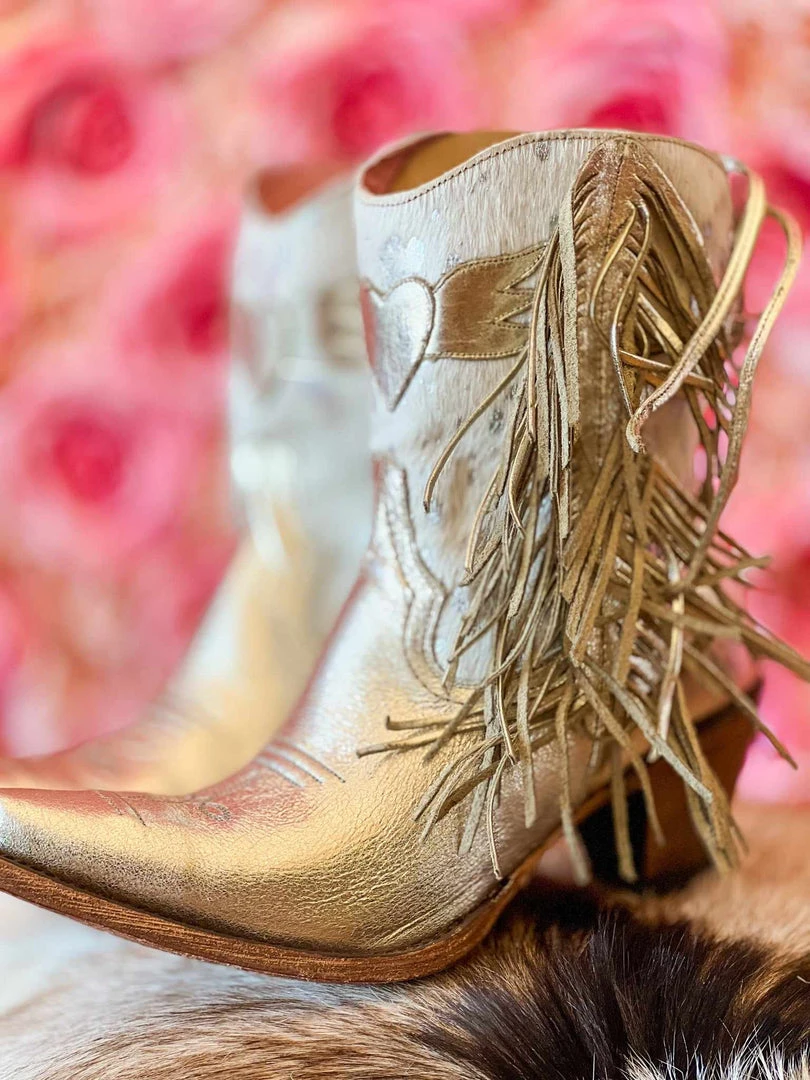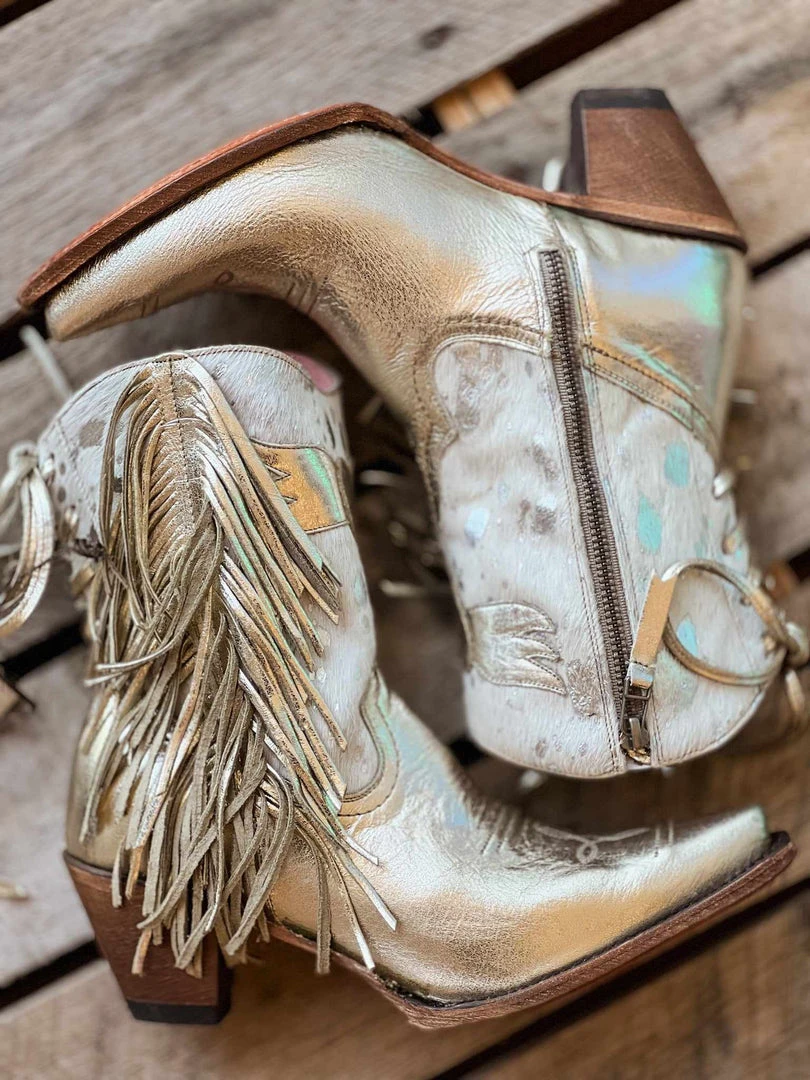 Shortie boots featuring an exclusive acid washed, hair on leather with metallic fringe, contrast inner lining, a side zipper, medium heel, and a stylish snip toe.