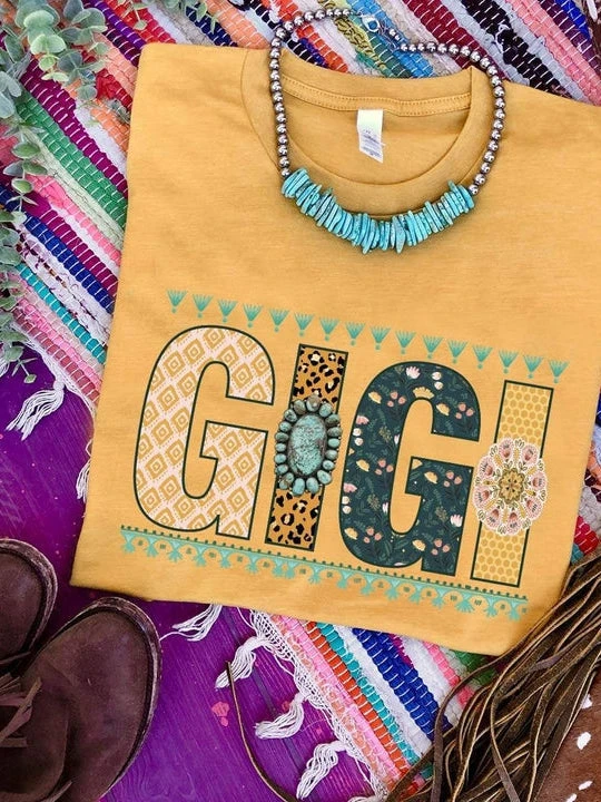 How cute is the Gigi Tee! Every Gigi in your life needs one! All the prints add a finishing touch! Printed on a soft style tee! Mustard color.