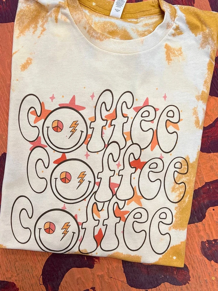Perfect for the Groovy Chics who love coffee! How cute is this t-shirt! It is so groovy! This tee is part of the Groovy Collection! Printed on a supersoft unisex tee. Mustard bleached colored tee.