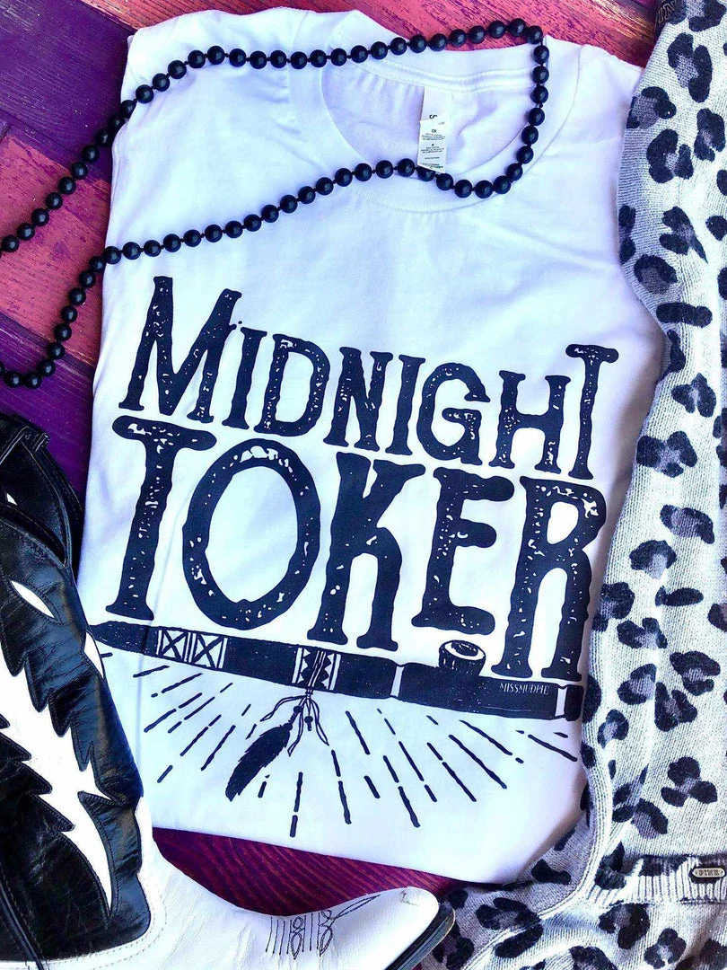 How cute is the midnight toker tee. Sit around a bonfire with your favorite friends jamming out to music and making the best memories with your people! This tee is printed on a soft style unisex white tee.