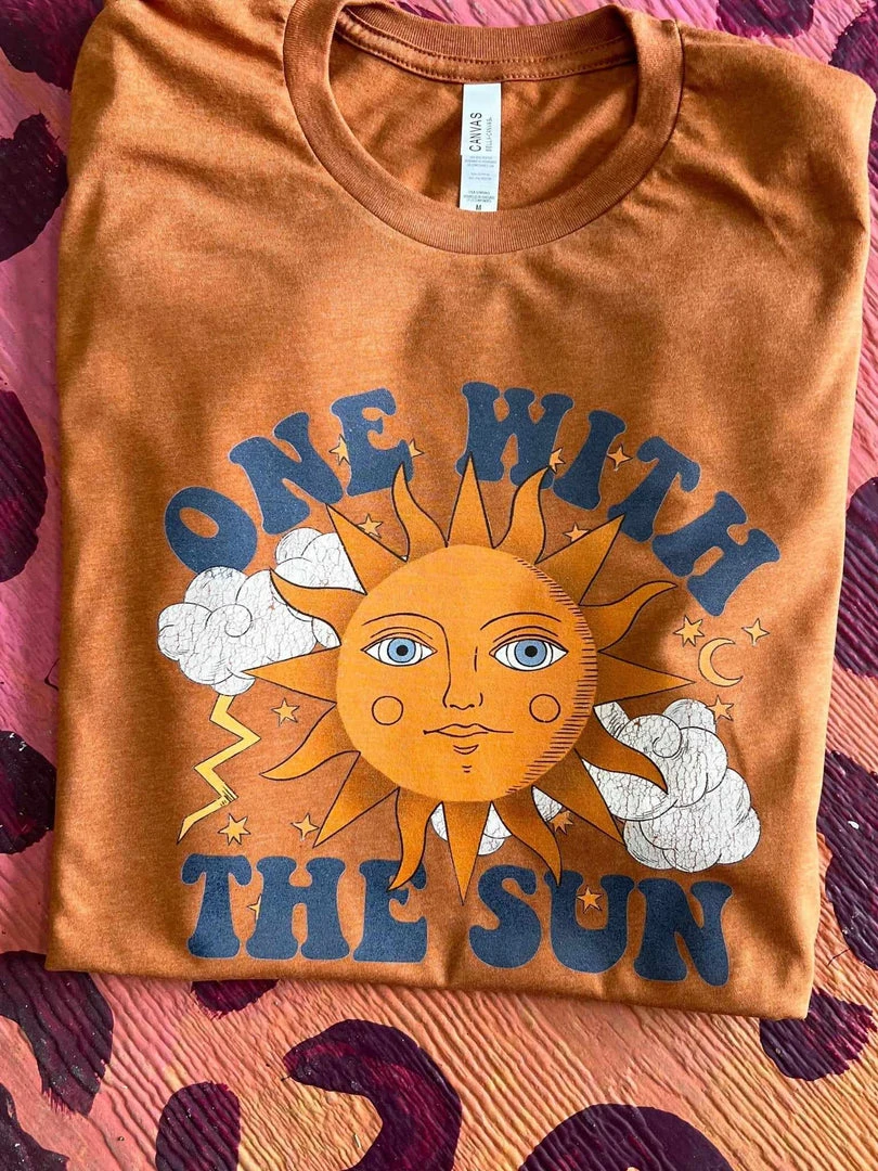 How cute is this t-shirt! One with the sun! This tee is part of the Celestial Collection. Printed on a supersoft unisex tee. Harvest colored.