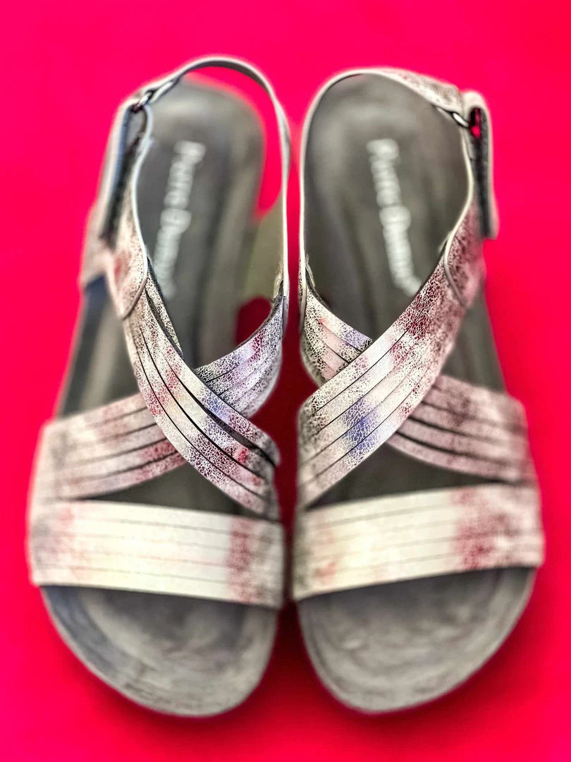 Chunky, edgy and oh so cool, these slingback wedge sandals are the perfect finishing touch to your summer looks! Featuring an open toe and criss cross straps in distressed silver, these put the “rock” in rockabilly!