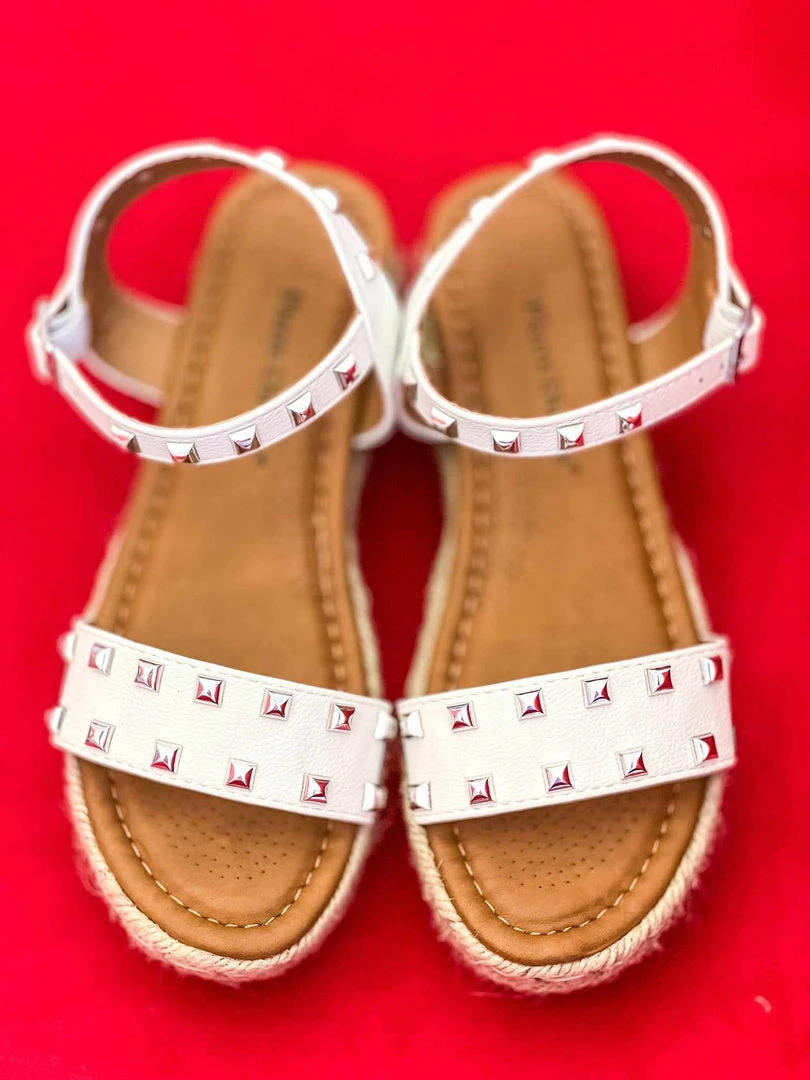 The beautiful blend of edgy and hippy these espadrille are the perfect summer sandals! White open toes straps featuring silver studs throughout, these slingback sandals are classy enough for a night out, and casual enough for a day of errands – sure to become your go-to sandal!