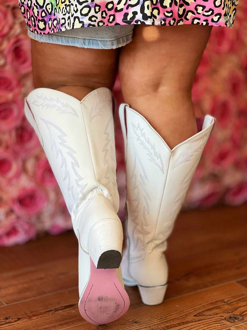 The Original Wide Calf Western “Loretta” Boot is now available for pre-order! This stunning western boot features trendy white leather and off white stitching. White boots & booties are all the rage right now for our Western Chics! Pink painted bottoms for a fun & flirty look.