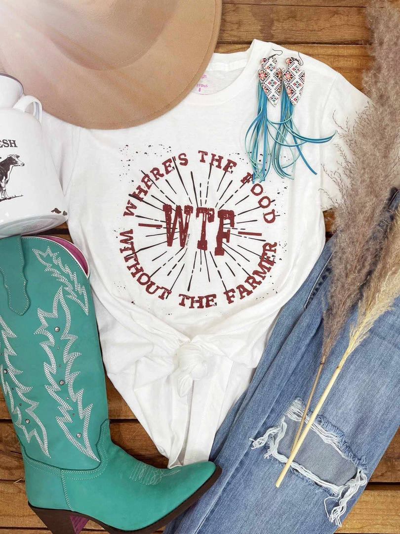 WTF Tee. Where’s The Food Without The Farmer? This is the perfect tee for all those chics who support the local farmer! Printed on a soft style unisex tee.