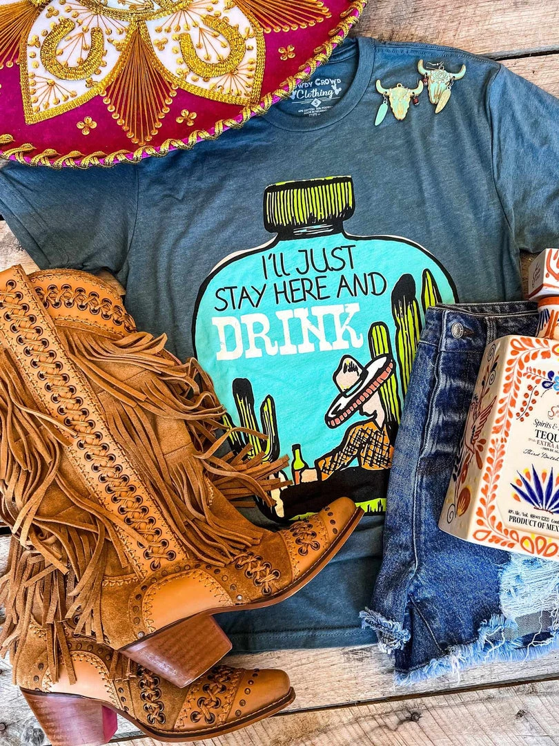 I’ll Stay Here And Drink! The party never stops in this t shirt! The colors are so vibrant! Perfect for layering! Graphic tees are our go-to!