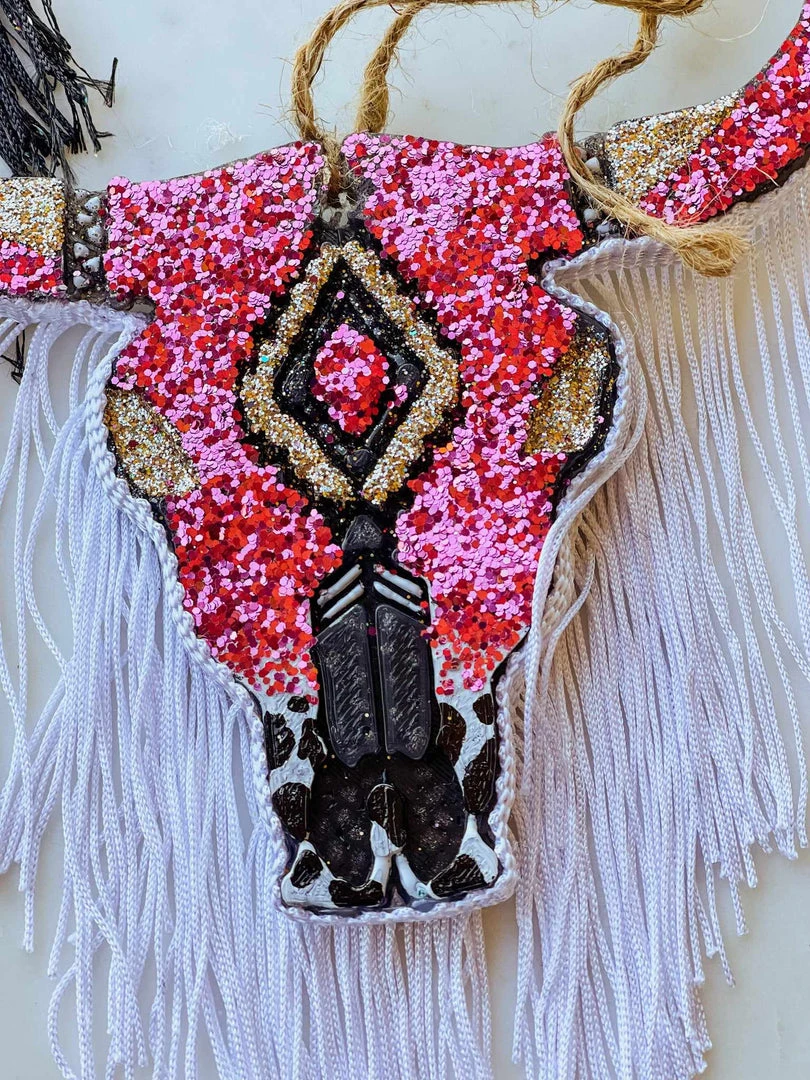 Southern Custom Designs New Arrivals Pink Glitter And Fringe Steer Freshie