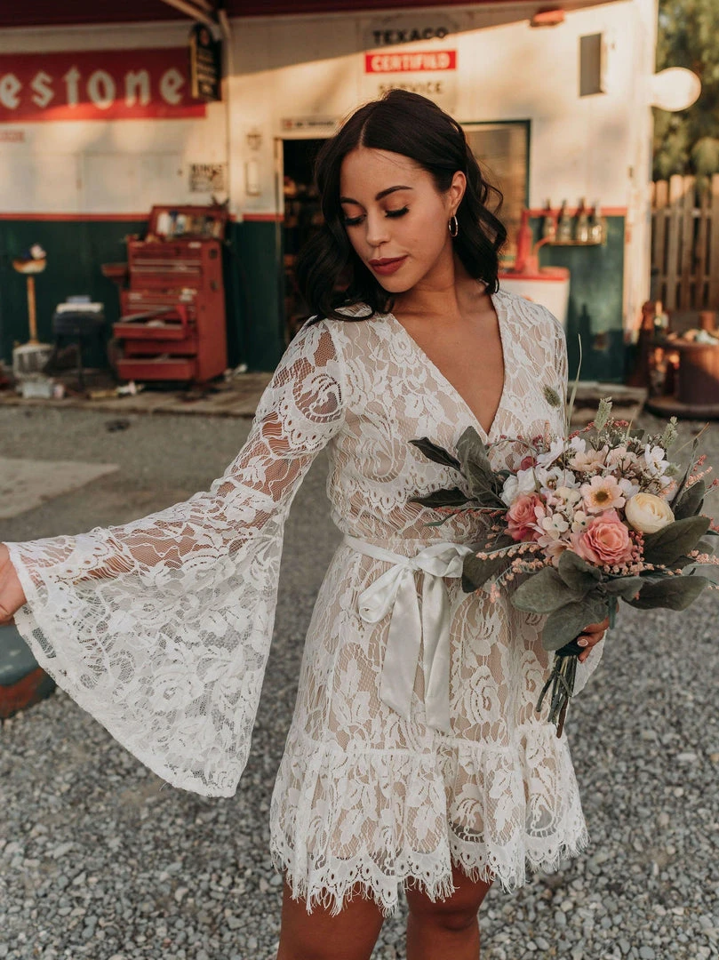 Lace has always been a southern chic trend. That is why our Lacey Belle Dress is going to be your forever dress! Paired with your favorite western boots or dress it up with heels! This dress features a neutral tone lining and has a v-neck neckline with an elastic waist. The sleeves are a beautiful belle sleeve and they are not lined. At the bottom, the dress has a ruffle of lace. A black satin belt is included with this dress, but not attached.