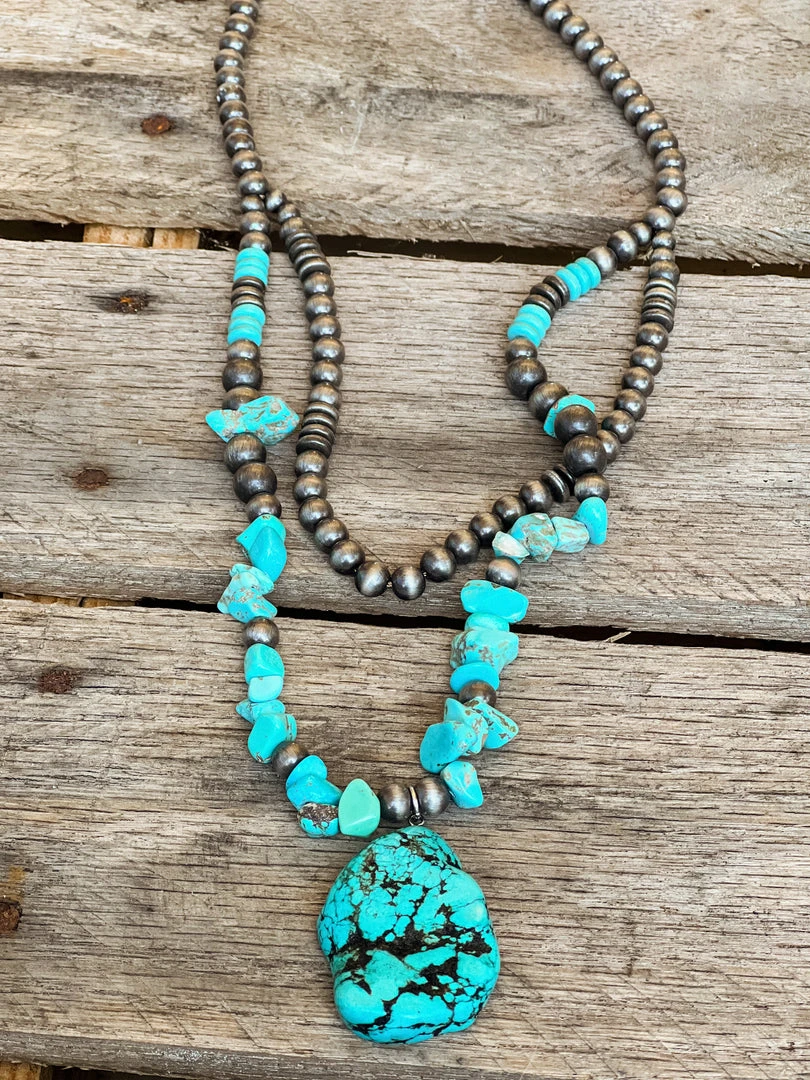 This turquoise stone pendant necklace is big and beautiful! Hanging from a double strand of Navajo pearls, this is a turquoise necklace you will cherish forever.