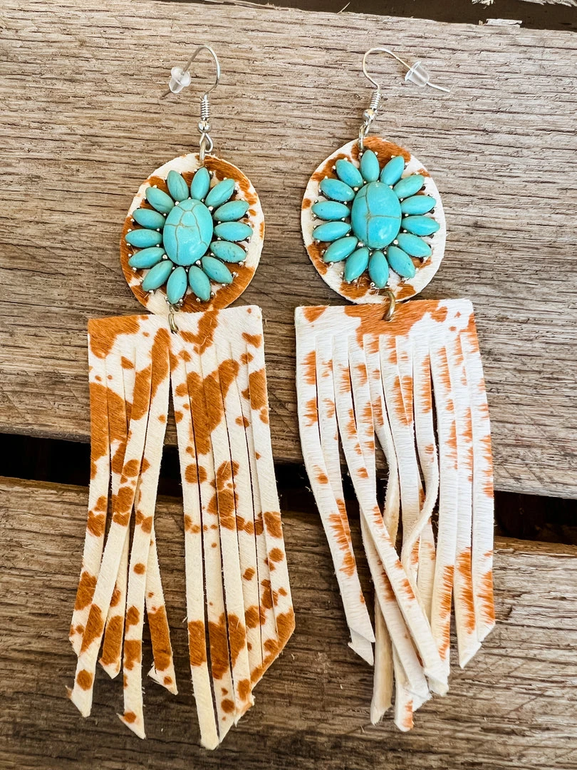 Turquoise Stone Concho Cowhide Tassel Earrings