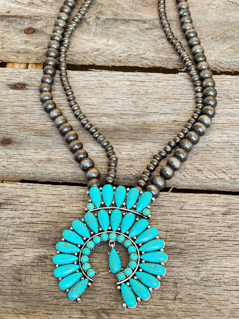 You can never have enough turquoise necklaces and this one sure is a beauty. The squash blossom design gives it a classic western feel set off with a double strand of silver beads.