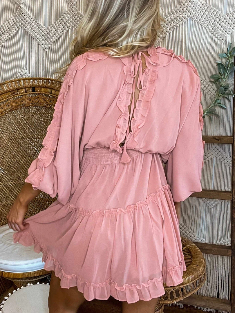 Ultra feminine flowy dress with empire waist, tiered skirt and lots of ruffle details. V-neck with loose half sleeves, this dress will emphasize your waist while hiding a tummy! Great summer dress for curvy chics!