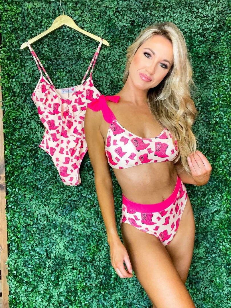 The ultimate bikini top for a country girl in hot pink cowgirl boot print! This bikini top features adjustable tie straps so you can customize the fit. Mix and match with any bikini bottom for multiple looks!