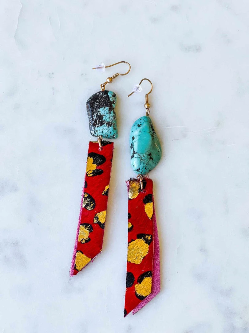 Your Fashion Wholesale Accessories Hot Pink Leopard Earrings With Gold Leaf And Turquoise
